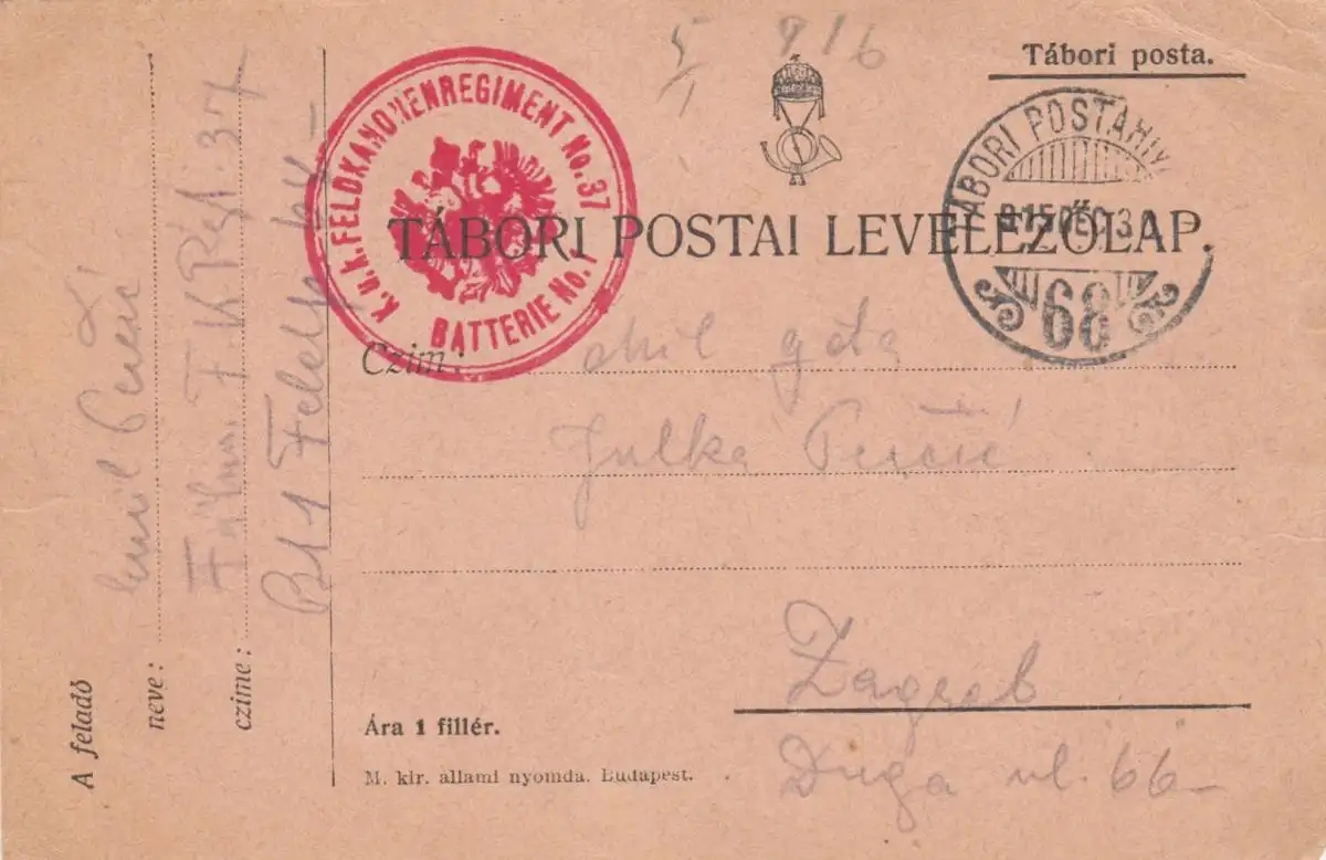 Tabori Postai Levelezolap FPNr. 68 nach Zagreb 1915