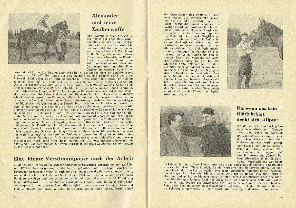 guter Zustand, geringe Gebrauchs- und Alterungsspuren: Umschlag und Seiten teils etwas eselsohrig / knittrig - Klammerrost - Papier teils etwas vergilbt, aber Seiten überwiegend sauber und ordentlich - Rückseite an der unteren Ecke 2x geknickt, Herzlich Willkommen - Folgende, am Platz trainierte zweijährige Pferde, freuen sich, Ihre Bekanntschaft zu machen - Dresdener Jockeys stellen sich vor - Generalausgleiche für 1959 - Traineranstalten in Dresden - 93 Pferde wurden für unseren Eröffnungstag genannt - Liste der Gewinner einer Jahreskarte für die Rennbahn - Adressen der Wettannahmen, Softcover, ca. 15 x 21, 20 Seiten mit 9 Bildern