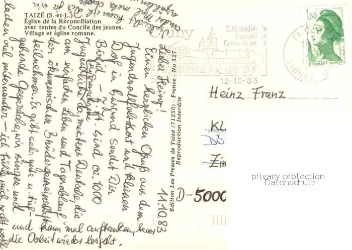 Taize_Saone-et-Loire Eglise de la Reconciliation avec tentes du Concile des jeunes Village et eglise romane Vue aerienne Taize Saone-et-Loire postalisch gelaufen 1983 Erhaltung siehe scans [WerneD78] WernPID7