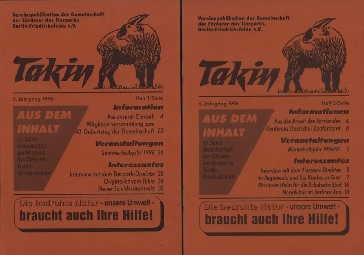 Titel: Takin. JG. 5 / HEFTE 1 und 2 (in 2 Heften). Vereinspublikation der Gemeinschaft der Förderer des Tierparks Berlin-Friedrichsfelde e.V