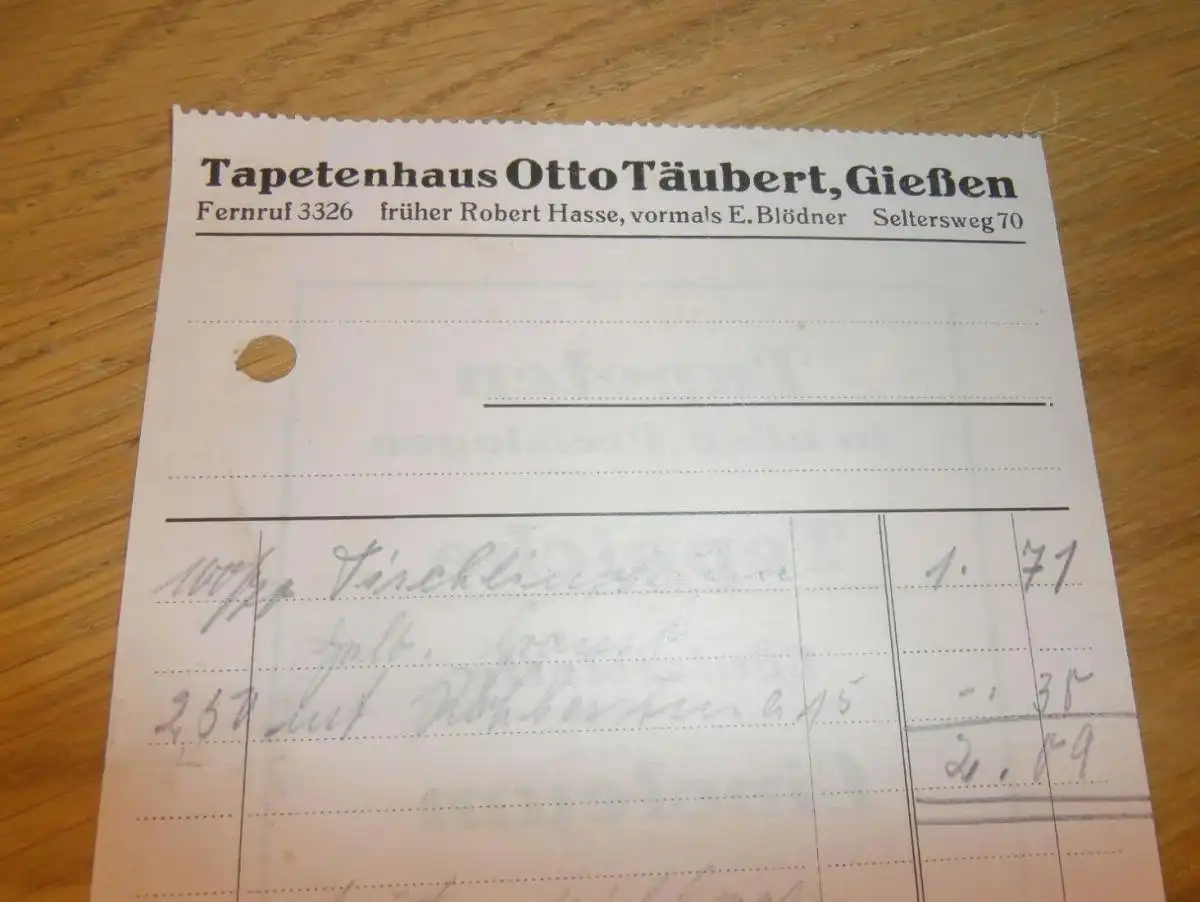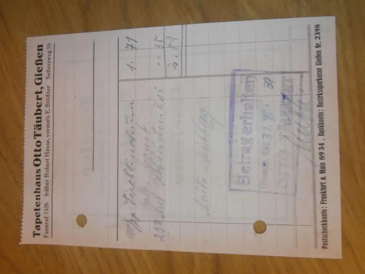 Tapetenhaus - Otto Täubert in Gießen , 1938 , altes Dokument / Rechnung , Reklame / Werbung , Giessen