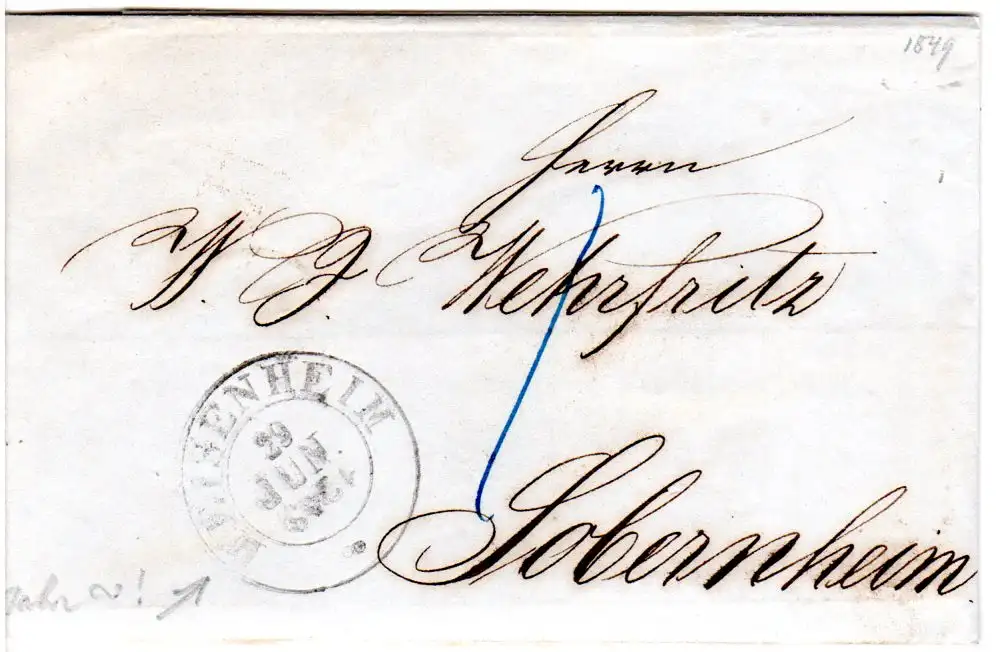 Taxis 1849, K2 Meisenheim m. verkehrt eingesetzter JZ auf Brief n. Sobernheim