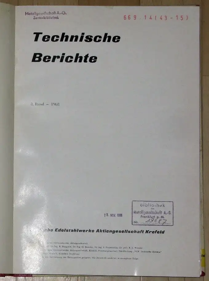 guter Zustand, Gebrauchs- und Alterungsspuren: ehemaliges Bibliotheksexemplar im Interimseinband mit umlaufendem Etikett - Titel mit Stempeln und Notizen - Deckel innen mit angeklebtem Papierrest - Vorsatz und Inhaltsverzeichnis mit weiteren Stempeln - Seiten aber sauber und ordentlich, Einfluß geringer Vanadingehalte auf Kornwachstum, Umwandlungs- und Härtbarkeitsverhalten sowie Zähigkeit bei Einsatzstählen. Helmut Brandis und Peter Kroy - Einfluß der Kaltverformung durch Ziehen auf die elastischen Eigenschaften der Stühle X 12 CrNi 18 8 (Remanit 1880) und 12 CrNi 17 7 (Remanit 1880 FH). Hans Preisendanz und Peter Schüler - Über das magnetische Streufeld austenitischer Bauteile. Hermann Dietrich - Eber magnetische Elementarbereiche. Karl Schüler - Betrachtungen zu den metallographischen Korngrößenbestimmungsverfahren, Teil II: Analyse der Größenbeziehungen in dem Diagramm nach Snyder-Graff zur Härtekornbestimmung von Schnellarbeitsstählen. Helmut Brandis und Karl Wiebking - Über diffusionschromierte Schrauben mit den Eigenschaften der Festigkeitsklasse 8.8. Günter Lehnert und Albert von den Steinen - Hochtemperaturkorrosion durch Vanadinpentoxid und Schwefelwasserstoff von Eisen, Nickel, Chrom, Nickel-Chrom-, Eisen-Chrom- und Nickel-Eisen-20% Chrom-Legierungen. Wolfgang Spyra - Zwischenentlastungen und Rückdehnungen bei verschiedenen Stählen bei erhöhten Temperaturen. Werner Schmidt - Zur Berechnung hitzebeständiger von außen beheizter Druckrohre für Röhrenöfen. Paul Gernhardt - Die Koerzitivfeldstärke. Karl Schüler - Hochfeste martensitaushärtende Nickelstühle. Karl Bungardt, Wolfgang Spyra und Albert von den Steinen - Entwicklung eines hochfesten martensitaushärtenden Stahles für den Reaktorbau. Wolfgang Spyra - Einfluß eines abgesenkten Nickelgehaltes auf einige Eigenschaften des Preßmatrizenstahles X 50 NiCrWV 13 13 (GSE). Hans Hermann Weigand und Edmund Haberling - Zur Problematik der Korngrößenbestimmung von Stählen durch Vergleichsmethoden. Helmut Brandis und Karl Wiebking - Einsatz eines Kleincomputers für die röntgenspektrochemische Analyse legierter Stähle. Herbert de Laffolie - Auswertung von Gemeinschaftsuntersuchungen über die Abkohlung von Schnellarbeitsstahl. Ernst Kunze und Helmut Brandis - Höhere Standzeiten beim Schneiden, Stanzen und Umformen durch den einzigen bearbeitbaren und härtbaren Hartstoff Ferro-TiC. Fritz Frehn - Nitrieren von Stählen mit hohem Kohlenstoff. Ernst Kunze und Helmut Brandis - Vergleich verschiedener Härteverfahren im Rahmen der Einsatzhärtung bei einem hochfesten Nickel-Chrom-Molybdän-Vergütungsstahl. Helmut Brandis - Nichtmagnetisierbare Eisenwerkstoffe in der Elektrotechnik. Hermann Dietrich - Magnete und Magnetsysteme für Kernmagnet-Meßwerke. Christian Joksch - Addition of Cobalt to the Ti-6Al-4V-Alloy. Emile Diderrich, Klaus Rüdinger, Gerhard Turlach und Lois Habraken - Neuere Entwicklung bei den Schnellarbeitsstählen. Hans Hermann Weigand - Direkthärtung von Einsatzstählen. Helmut Brandis - Werkzeugstähle für die neuzeitliche Kunststoff-Verarbeitung. Werner Krebs - Thermoschockprüfung von Turbinenschaufeln mit Oberflächenschutz. Günter Lehnert - Untersuchungen an einem martensitaushärtenden hochfesten rostbeständigen Stahl. Karl Bungardt und Wolfgang Spyra - Verwendung molybdänlegierter Chrom-Nickel-Stähle im Bauwesen. Günther Hebbel - Rostfreie Chromstähle mit Molybdänzusatz im Bau von Personenkraftfahrzeugen. Karl-Heinz Burchert - Tieftemperatureigenschaften von Invar. Hermann Dietrich - Ultraschall in der Fertigungs- und Prüftechnik. Karl-Ernst Wetzlar - Wesen und Problematik der Pulvermetallurgie. Günther Ritzau - Ober die geschichtliche Entwicklung und heutige Bedeutung der Pulvermetallurgie ins Rahmen der Deutschen Edelstahlwerke Aktiengesellschaft. Werner Hotop - Herstellungsverfahren und technologische Eigenschaften von gesinterten Dauermagneten. Karl Schüler - Beitrag zum Mahl- und Sinterverhalten von Bariumferriten. Karl Bungardt, Peter Kassner und Fritz Thümmler - Über die Gefügestabilität von Sinter- und Gußmagneten des Typs AlNiCo 500. Hermann Dietrich - Über den Einfluß der Feinzerkleinerung auf die Koerzitivfeldstärke von Barium-und Strontiumferrit. Henning Georg Richter - Einfluß des Aluminiumgehaltes auf die magnetischen Eigenschaften von gesintertem Oerstit (AlNiCo). Günther Lange - Über die Herstellung von hartferritischen Dauermagneten unter Berücksichtigung spezieller Formgebungsverfahren. Henning Georg Richter und Heinrich Völler - Über die pulvermetallurgische Herstellung kohlenstoffhaltiger Magnetstähle für Hysteresemotoren. Peter Kassner, Hans Egon Arntz und Hermann Dietrich - Untersuchung der Kohlenstoff-, Sauerstoff- und Stickstoffaufnahme einiger AlNiCo-Magnetlegierungen beim Sintern unter verschiedenen Atmosphären. Ulrich Bohnstedt, Hans Grewe und Peter Kassner - Beitrag zur elektronenmikroskopischen Untersuchung hartmagnetischer Pulver. Elisabeth Horn, Peter Kassner und Hermann Dietrich - Zur Kenntnis des Sinterverhaltens von Preßlingen aus Reineisenpulvern und Eisen-Mangan-Pulvergemischen. Karl Mauer und Hans Grewe - Über die Veränderung der Kobaltphase bei der Attritor-Naßmahlung von Karbid-Kobalt-Gemischen. Hans Mariacher, Elisabeth Horn, Manfred Berndt und Kurt Schell - Pulvermetallurgisch erzeugter Werkstoff mit hohem Karbidgehalt für Werkzeuge und Verschleißteile. Fritz Frehn - Nitrierung des Hartstoffes Ferro-TiC-P 143. Helmut Brandis, Fritz Frehn und Karl Wiebking - Betriebliche Probleme bei der Probesiebanalyse von Pulvern mit spratziger Teilchengestalt. Ludwig Elßner - Hochwarmfeste Verbundwerkstoffe auf Kobalt- und Nickelbasis. Herbert Grünewald - Thermische Spritzverfahren. Gerhard Tschentke und Helmut Salzmann, Halbleinen, ca. 21 x 29,5, 286 Seiten mit zahlreichen Bildern