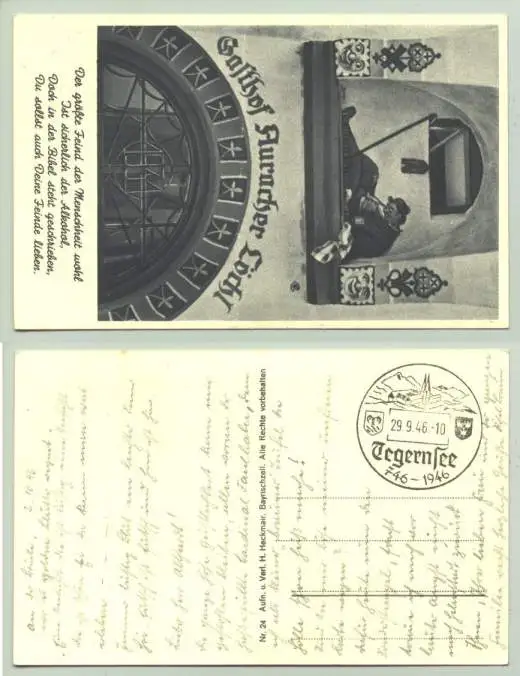 Artikelbeschreibung u. Zustand : Siehe Scan. Weitere Infos : Ansichtskarte. Gasthaus Auracher Loechl. PLZ-Bereich pauschal 83684. Postalisch gelaufen mit herrlichem Sonderstempel von Tegernsee 1946