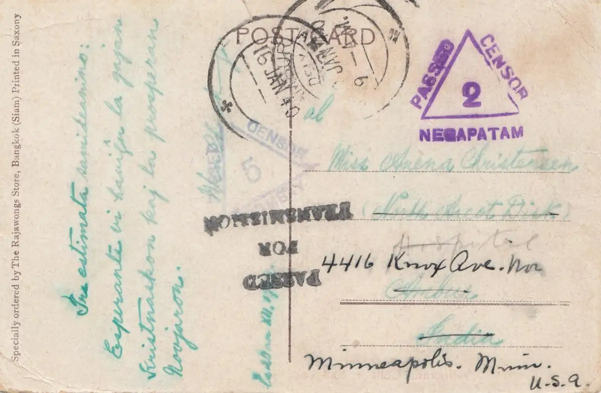 Thailand 1940: post card Bangkok to Mineapolils, censor