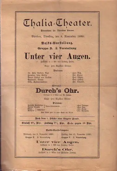 Thalia - Theater (Breslau). - Direction: Theodor Loewe. - Fulda, Ludwig und Jordan, W: Programmzettel zu: Unter vier Augen. Lustspiel in 1 Akt. / Jordan: Durch´s Ohr. Lustspiel in 3 Akten. Regie: Herr Steinar. Aufführung: 8. November 1898. (Aus der Bresl