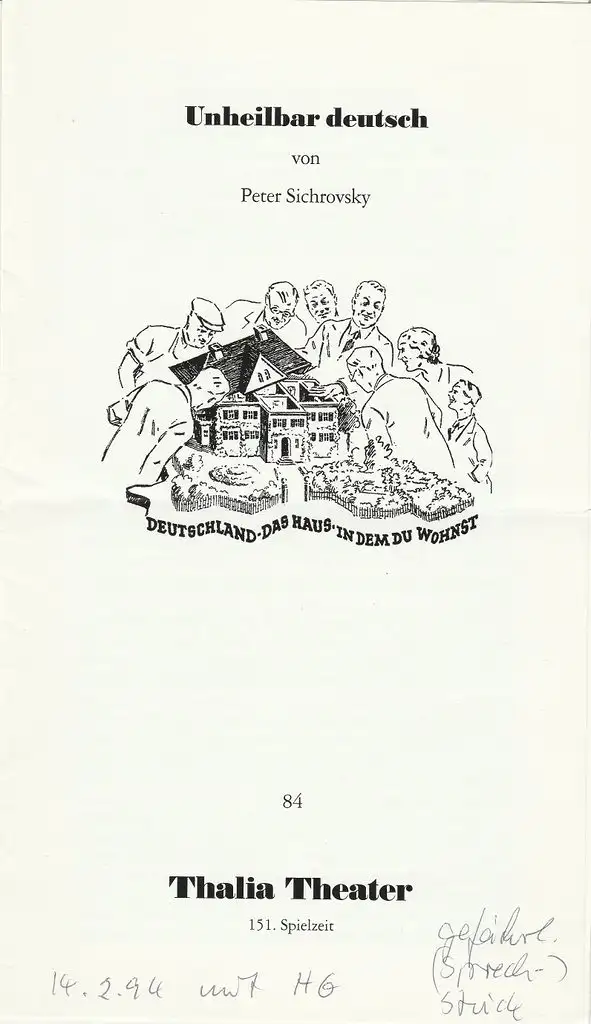 Unheilbar Deutsch. Deutschland- Das Haus in dem Du wohnst. In der Fassung des Thalia Theaters. Regie: Barbara Kröger. Bühne: Annette Breuer. Kostüme: Falk Bauer. Mitwirkende: Hildegard Schmahl, Angelika Thomas, Nicola Thomas, Josef Bilous, Peter Maertens, u. a. - Schlüsselwörter: Theaterprogramm, Opernprogramm, Ballettprogramm, Musicalprogramm, Konzertprogramm, Theatermemorabilia, Programmhefte Sammlung, deutsche Theatergeschichte.