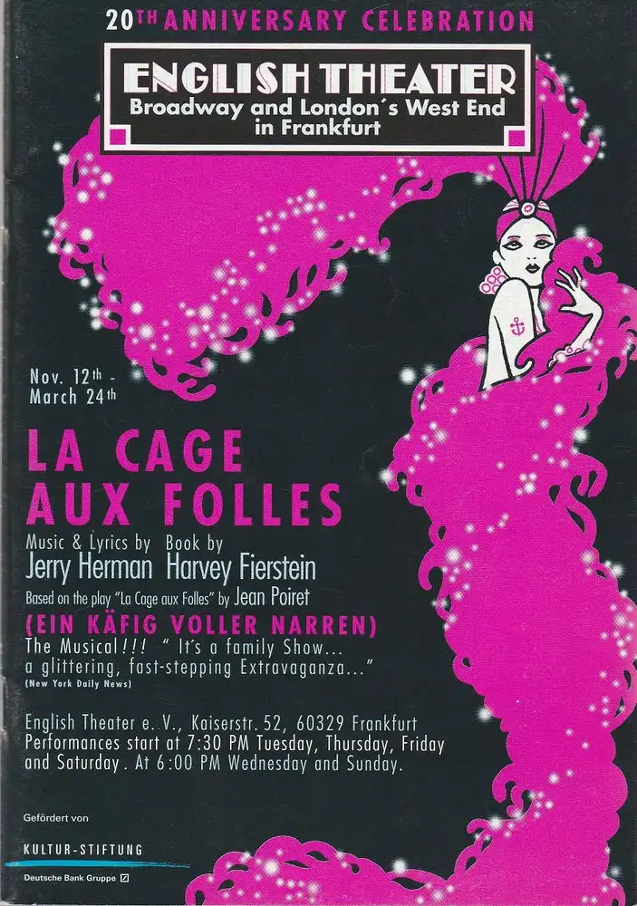 The English Theater, Judith Rosenbauer, Marie Luise Herbst: Programmheft Jerry Herman / Harvey Fierstein LA CAGE AUX FOLLES Nov. 12th 1999 - March 24th 2000.