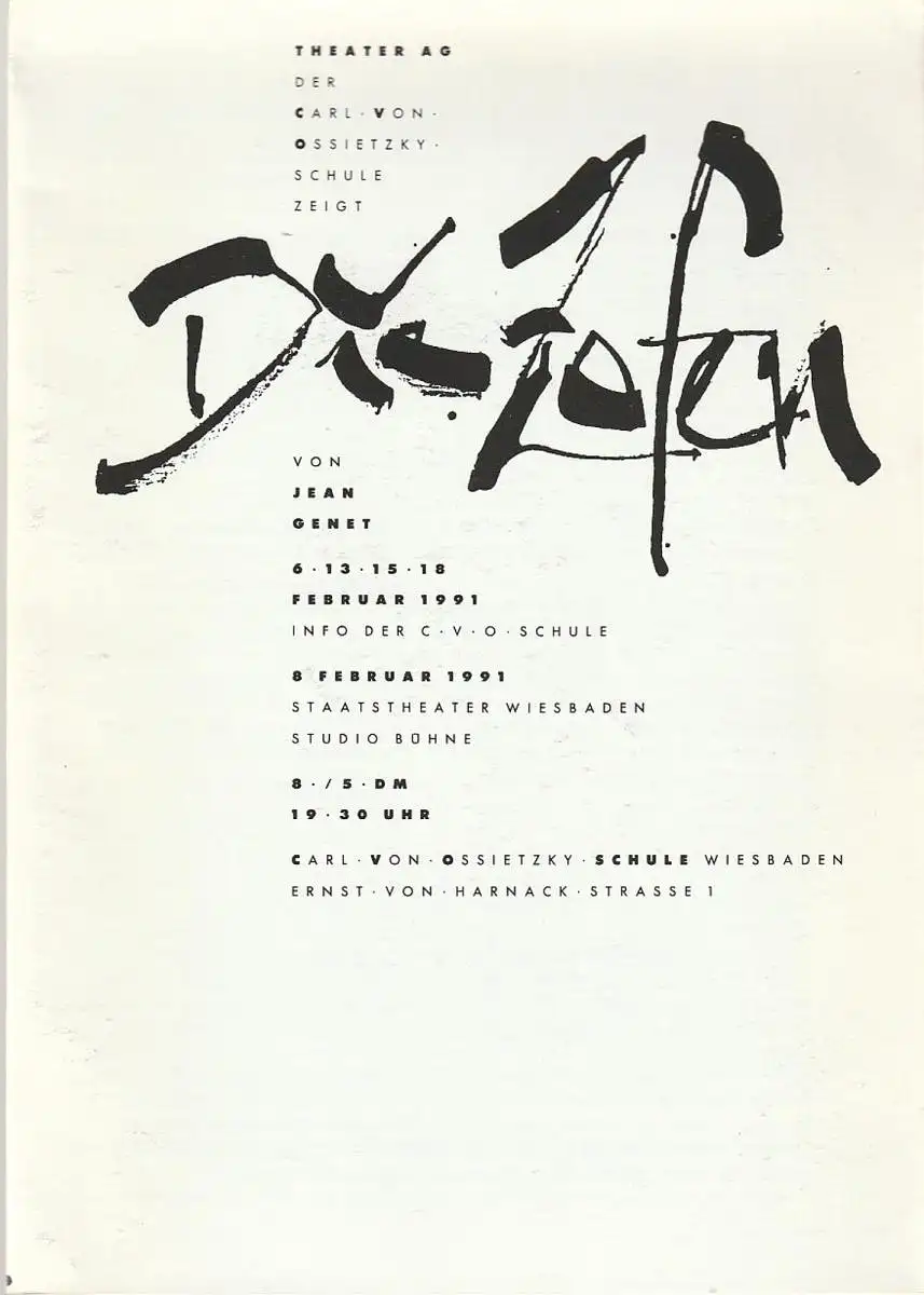 Theater AG der Carl-von-Ossietzky-Schule Wiesbaden: Programmheft Jean Genet DIE ZOFEN Premiere 6. Februar 1991.