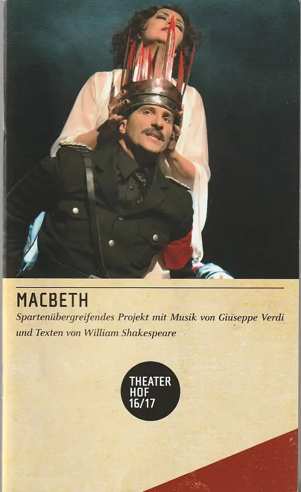 Spartenübergreifendes Projekt mit Musik von Giuseppe Verdi und Texten von Shakespeare. Eingerichtet für das Theater Hof von Reinhardt Friese. Musikalische Leitung: Roland Vieweg. Inszenierung: Reinhardt Friese. Choreographie und Schwertkampf: Tamas Mester. Bühne: Günter Hellweg, Annette Mahlendorf. Kostüme: Annette Mahlendorf. Mitwirkende: Ralf Hocke, Jörn Bregenzer, KacKenzie Gallinger, Marco Stickel, James Tolksdorf, Oliver Hildebrandt, Daniel Milos, Miriam Schwan, Julia Leinweber, Martina Schmitz, Marieke Kregel & Yamina Maamar, u.a. - Theaterprogramm, Opernprogramm, Ballettprogramm, Musicalprogramm, Konzertprogramm, Theatermemorabilia, Programmhefte Sammlung, deutsche Theatergeschichte.