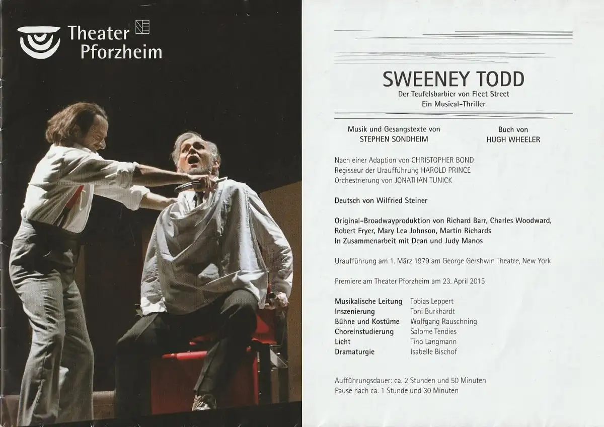 Der Teufelsbarbier von Fleet Street. Nach einer Adaption von Christopher Bond. Musikalische Leitung: Tobias Leppert. Inszenierung: Toni Burkhardt. Bühne und Kostüme: Wolfgang Rauschning. Mitwirkende: Thomas Christ, Femke Soetenga, Edward Lee, Franziska Tiedtke, Benjamin Savoie, Jon Geoffrey Goldsworthy, Steffen Fichtner, Gabriela Zamfirescu, Andrea M. Pagini, Mathias Reiter, u.a. - Theaterprogramm, Opernprogramm, Ballettprogramm, Musicalprogramm, Konzertprogramm, Theatermemorabilia, Programmhefte Sammlung, deutsche Theatergeschichte.