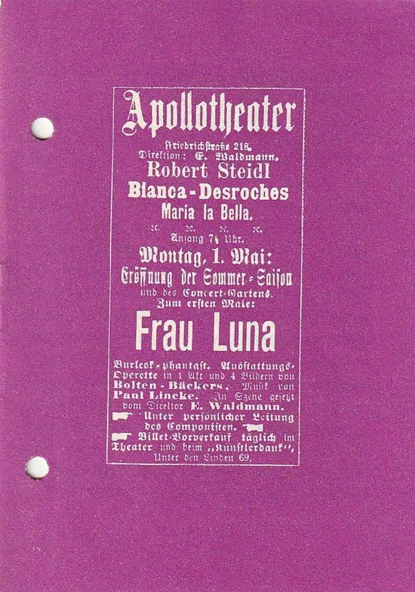 Operette in zwei Akten von Bolten-Baeckers. Textliche Neufassung von Otto Schneidereit. Regie: Helmut Müller. Musikalische Leitung: Toni Steidl. Ausstattung: Karl-Heinz Abramowski. Choreographie: Assen Stantschew. Mitwirkende: Thomas Heidecke, Theo Hülsmann, Josef Prautsch, Linda Hofmann, Inge Nahlik-Freiheit, Margot Schneider, Christa Hüther / Sigrun Iffland, Elke Hartmann, u.a. - Theaterprogramm, Opernprogramm, Ballettprogramm, Musicalprogramm, Konzertprogramm, Theatermemorabilia, Programmhefte Sammlung, deutsche Theatergeschichte.
