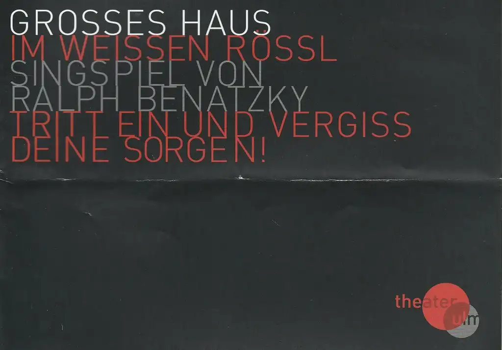 Im weißen Rössl. Tritt ein und vergiß Deine Sorgen. Singspiel in drei Akten. Eingerichtet für das Theater Ulm von Nils Schweckendiek. Musikalische Leitung: Nils Schweckendiek. Inszenierung: Andreas von Studnitz. Bühne: Britta Lammers. Kostüme: Angela C. Schuett. Mitwirkende: Edith Lorans, Alexander Schröder, Walter von Have, Arantza Ezenarro, Hans-Günther Dotzauer, Girard Rhoden, u. a. - Schlüsselwörter: Theaterprogramm, Opernprogramm, Ballettprogramm, Musicalprogramm, Konzertprogramm, Theatermemorabilia, Programmhefte Sammlung, deutsche Theatergeschichte.