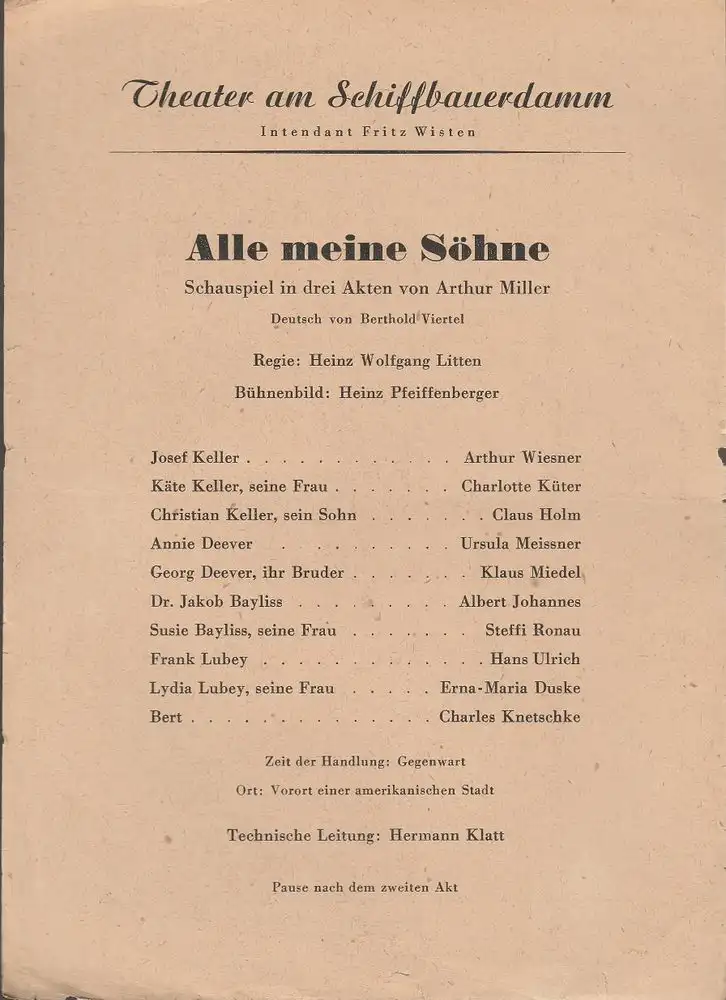 Theater am Schiffbauerdamm, Fritz Wisten: Theaterzettel Arthur Miller ALLE MEINE SÖHNE 1949.