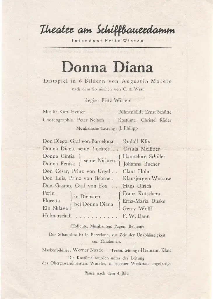 Theater am Schiffbauerdamm, Fritz Wisten: Theaterzettel Augustin Moreto DONNA DIANA 1950.