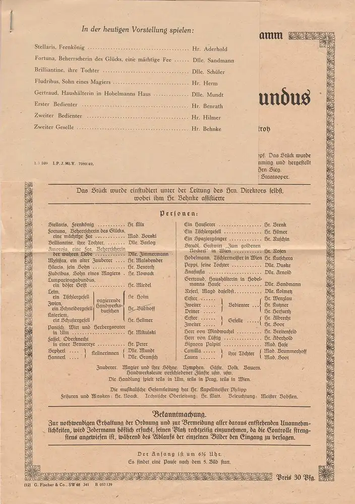 oder: Das liederliche Kleeblatt. Zauberposse mit Gesang. Inszenierung: Fritz Wisten. Musikalische Leitung: Herr Philipp. Mitwirkende: Herr Klix, Frau Borski, Frau Barlog, Frau Zimmermann, u. . - Theaterprogramm, Opernprogramm, Ballettprogramm, Musicalprogramm, Konzertprogramm, Theatermemorabilia, Programmhefte Sammlung, deutsche Theatergeschichte.