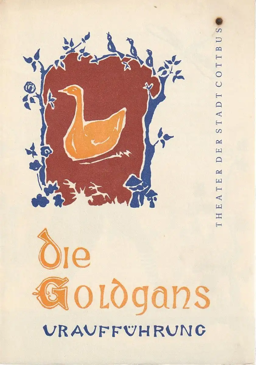 Musikalisches Märchenspiel in drei Bildern - frei nach dem Grimmschen Märchen Die goldene Gans - von J. A. Weindich. Musik: Gerhard Tittel. Inszenierung: Hans Joachim Schröpfer. Musikalische Leitung: Walter Böhnisch. Ausstattung: Ilse Hauptvogel. Choreographie: Frank Männel / Jochen Kurth. Mitwirkende: Wolfgang Steinberg, Klaus-Peter Hermann, Gerhard Rösler, Harald Fiedler, Hans-Joachim Schröpfer / Hinnerk Einhorn, Dietrich Böge, Peter Trittmacher, Annerose Schäfer, u.a. - Programmhefte24 - Programmhefte für Theater, Oper & Ballett.
