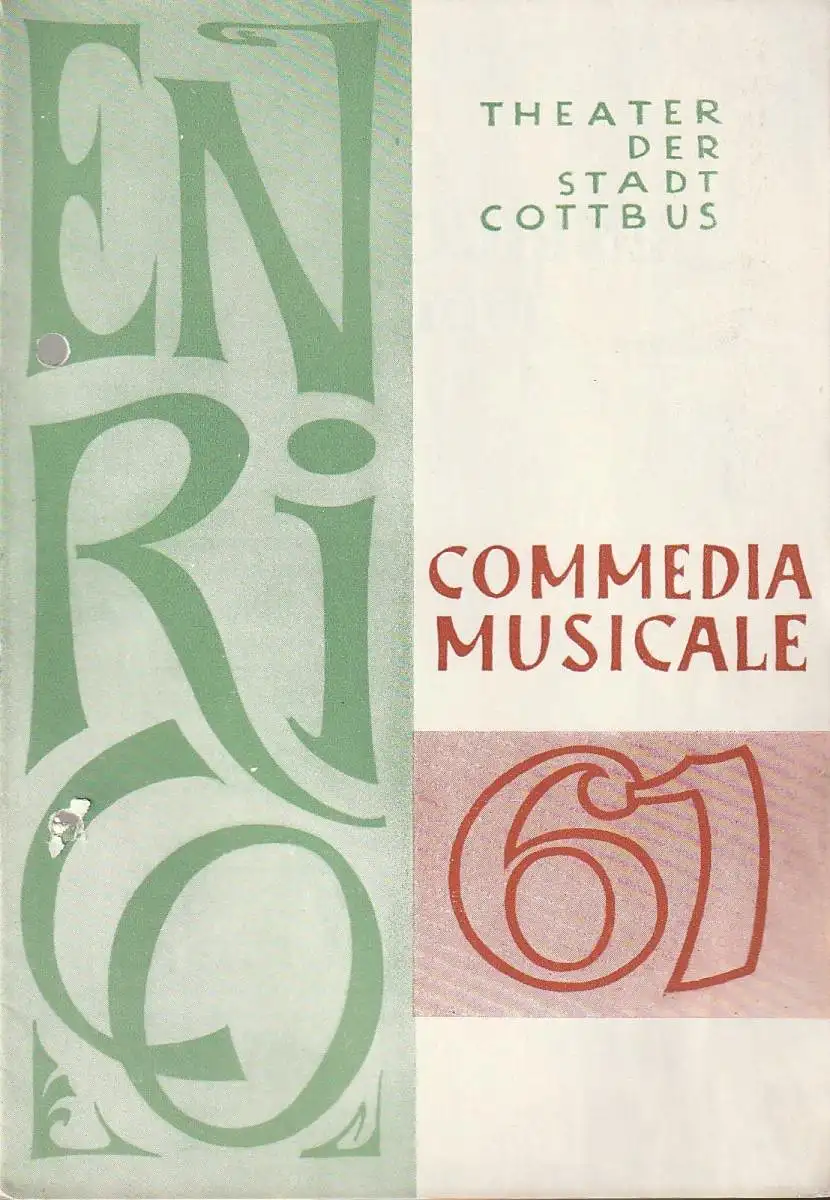 Commedia Musicale von Garinei und Giovannini. Inszenierung: Dietrich H. Litt. Musikalische Leitung: Klaus Wiese. Ausstattung: Ilse Hauptvogel. Tänze: Bruno Wolf. Regieassistenz: Hinnerk Einhorn. Mitwirkende: Dieter Gööck, Werner Knodel, Hansdieter Neumann, Hans Strzelczyk, Uwe Kokisch, Werner Kiersch, Joachim Gäbler, u. a. Chor und Ballett des Theaters der Stadt Cottbus - Theaterprogramm, Opernprogramm, Ballettprogramm, Musicalprogramm, Konzertprogramm, Theatermemorabilia, Programmhefte Sammlung, deutsche Theatergeschichte.