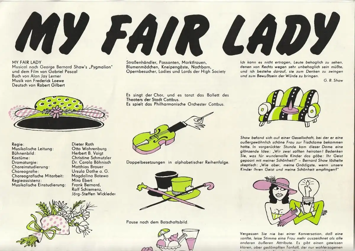 nach Bernard Shaws Pagmalion und dem Film von Gabriel Pascal. Buch: Alan Jay Lerner. Musik: Frederick Loewe. Regie: Dieter Roth. Musikalische Leitung: Otto Wahrenburg. Bühne: Herbert B. Voigt. Kostüme: Christine Schmutzler. Choreographie: Ursula Dathe. Regieassistenz: Mira Ebert. Mitwirkende: Burkhard Plettau, Hans-Joachim Schröpfer, Heike Meyer, Joachim Gäbler / Werner Kiersch, Gunter Wurzel, Iris Klinke,Ingrid Braun, Erika Reinwald, u. a. - Theaterprogramm, Opernprogramm, Ballettprogramm, Musicalprogramm, Konzertprogramm, Theatermemorabilia, Programmhefte Sammlung, deutsche Theatergeschichte.