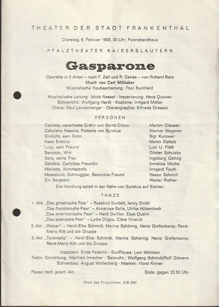Titel: Programmheft Carl Millöcker GASPARONE 6. Februar 1968 Feierabendhaus Frankenthal