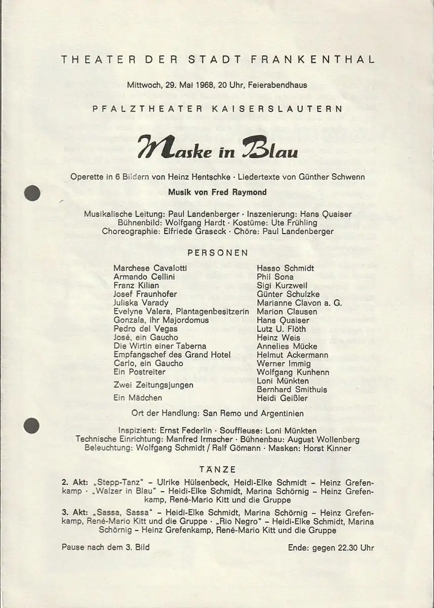 Theater der Stadt Frankenthal, Feierabendhaus: Programmheft Fred Raymond MASKE IN BLAU 29. Mai 1968 Feierabendhaus Frankenthal.