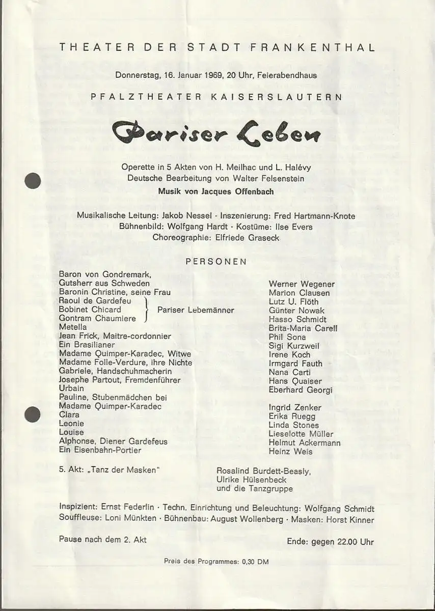 Theater der Stadt Frankenthal, Feierabendhaus: Programmheft Jacques Offenbach PARISER LEBEN 16. Januar 1969 Feierabendhaus Frankenthal.