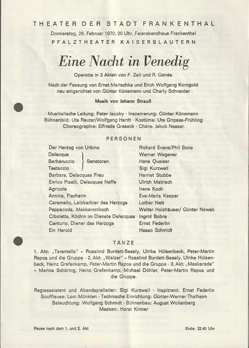 Titel: Programmheft Johann Strauß EINE NACHT IN VENEDIG 26. Februar 1970 Feierabendhaus Frankenthal