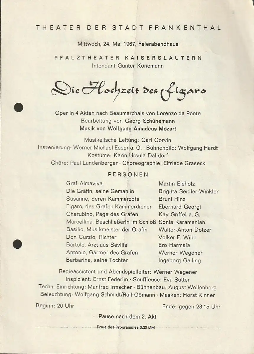 Theater der Stadt Frankenthal, Feierabendhaus: Programmheft Wolfgang Amadeus Mozart DIE HOCHZEIT DES FIGARO 24. Mai 1967 Feierabendhaus Frankenthal.