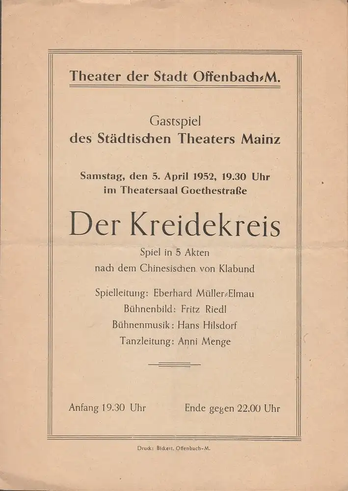 Theater der Stadt Offenbach: Programmheft Klabund DER KREIDEKREIS 5.April 1952 Theatersaal Goethestr.