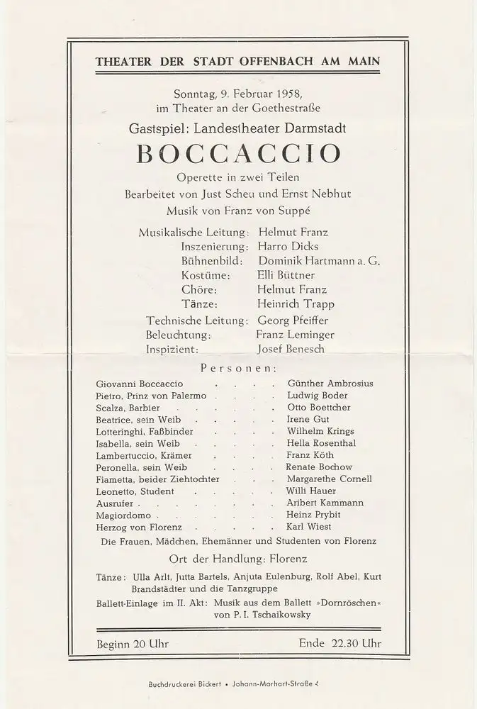 Theater der Stadt Offenbach am Main: Theaterzettel Franz von Suppe BOCCACCIO 9. Februar 1958 Theater an der Goethestraße.