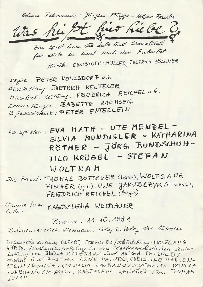 Von Helma Fehrmann, Jürgen Flügge und Holger Funke. Ein Spiel um die Liebe und Sexualität für Leute in und nach der Pubertät. Musik: Christoph Müller, Dietrich Zöllner. Regie: Peter Volksdorf. Ausstattung: Dietrich Kelterer. Musikalische Leitung: Friedrich Reichel. - Theaterprogramm, Opernprogramm, Ballettprogramm, Musicalprogramm, Konzertprogramm, Theatermemorabilia, Programmhefte Sammlung, deutsche Theatergeschichte.