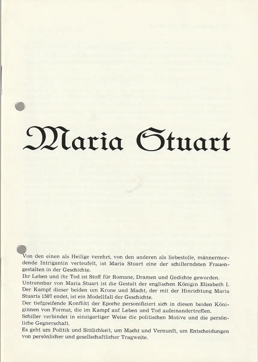 Trauerspiel in fünf Akten. Regie: Matthias Renner. Ausstattung: Fritz Werner. Musik: Friedrich Reichel. Mitwirkende: Birge Arnold, Ute Menzel, Frank Damerius, Karl Enzmann, Dieter Maas, Friedrich Schmidt, Jörg Bundschuh, u.a. - Theaterprogramm, Opernprogramm, Ballettprogramm, Musicalprogramm, Konzertprogramm, Theatermemorabilia, Programmhefte Sammlung, deutsche Theatergeschichte.