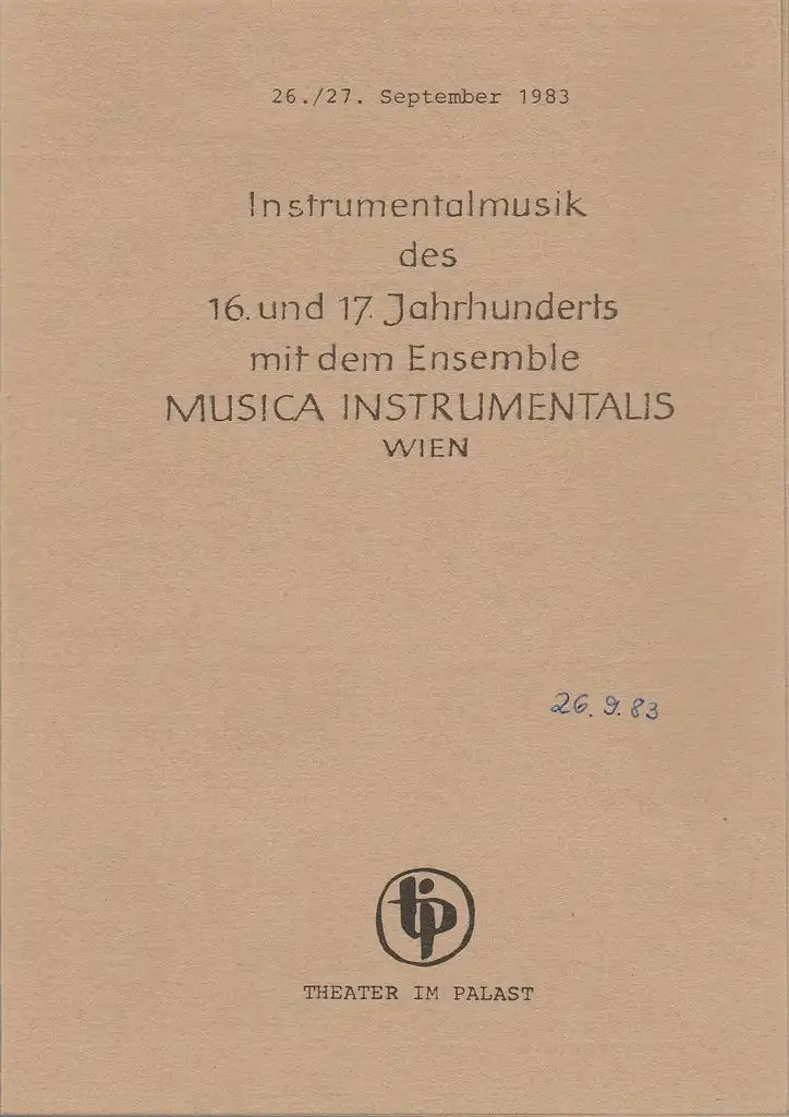 Titel: Programmheft INSTRUMENTALMUSIK DES 16. und 17. JAHRHUNDERTS Ensemble MUSICA INSTRUMENTALIS WIEN 26. und 27. September 1983 Theater im Palast