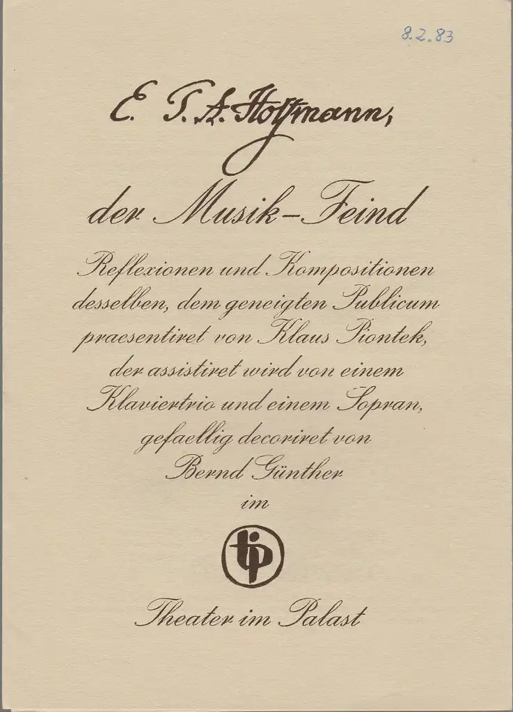 Theater im Palast, Vera Oelschlegel, Reiner Adler, Gerhard Kruschel: Programmheft E. T. A. HOFFMANN DER MUSIKFEIND Premiere 10. Oktober 1982.