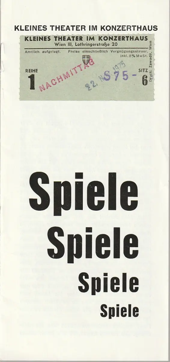 Stück in zwei Akten. Inszenierung: Jochen Brockmann. Bühne: Wolfgang Müller- Karbach. Kostüme: Herbert Jurik. Mitwirkende: Miguel Herz-Kestranek, Elrirede Ramhapp, Herbert Kersten, Ludwig Hirsch, Erwin Neuwirth, u. a. - Theaterprogramm, Opernprogramm, Ballettprogramm, Musicalprogramm, Konzertprogramm, Theatermemorabilia, Programmhefte Sammlung, deutsche Theatergeschichte.