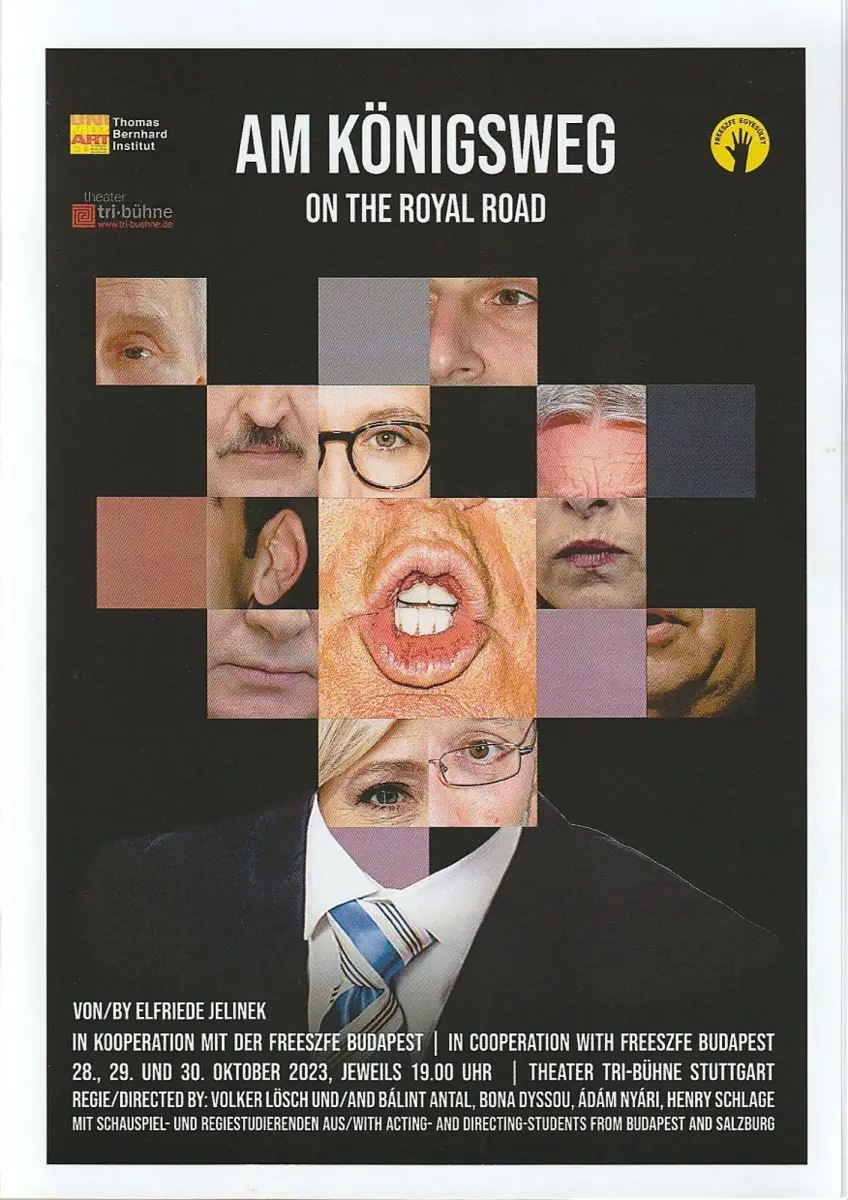 ON THE ROYAL ROAD. In Kooperation mit der Freeszfe Budapest. 28. - 30. Oktober 2023. Regie: Volker Lösch, Balint Antal, Bona Dyssou, Adam Nyari, Henry Schlage mit Schauspiel- und Regiestudenten aus Budapest und Salzburg - Theaterprogramm, Opernprogramm, Ballettprogramm, Musicalprogramm, Konzertprogramm, Theatermemorabilia, Programmhefte Sammlung, deutsche Theatergeschichte.
