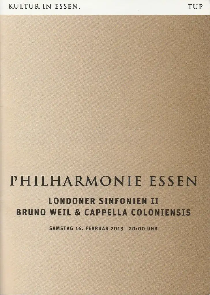 Theater und Philharmonie Essen, Johannes Bultmann, Berger Bergmann, Uta Appelbaum, Christoph Dittmann: Programmheft LONDONER SINFONIEN II BRUNO WEIL & CAPELLA COLONIENSIS 16. Februar 2013 Philharmonie Essen.