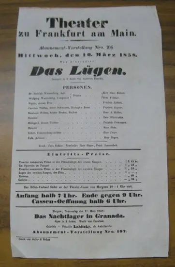 Titel: Besetzungsliste zu: Das Lügen ( neu einstudirt ). Mittwoch, den 10. März 1858, Abonnement-Vorstellung Nro. 106 im Theater zu Frankfurt am Main. - Lustspiel in 4 Acten von Roderich Bendix. - Darsteller: die Herren Alex. Kökert, ( Theo ) Vollmer, A. Müller, Werkenthin, Stotz, Leser und Degen / Fräulein ( Friedrike ) Bognar, ( Mathilde ) Gräcmann und Liebich