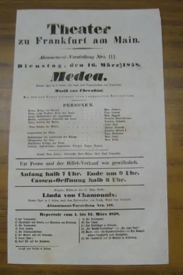 Theater zu Frankfurt am Main. Intendanz: Roderich Benedix. - Georg Friedrich Treitschke / Luigi Cherubini. - Franz Lachner: Besetzungsliste zu: Medea. Dienstag, den 16. März 1858, Abonnement-Vorstellung Nro. 111 im Theater zu Frankfurt am Main. - Grosse O