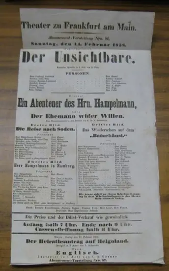 Theater zu Frankfurt am Main. Intendanz: Roderich Benedix. - Karl Eule / Ernst Hermann Adolf Hallenstein: Besetzungsliste zu: Der Unsichtbare. Neu einstudirt. Sonntag, den 14. Februar 1858, Abonnement-Vorstellung Nro. 86 im Theater zu Frankfurt am Main. -