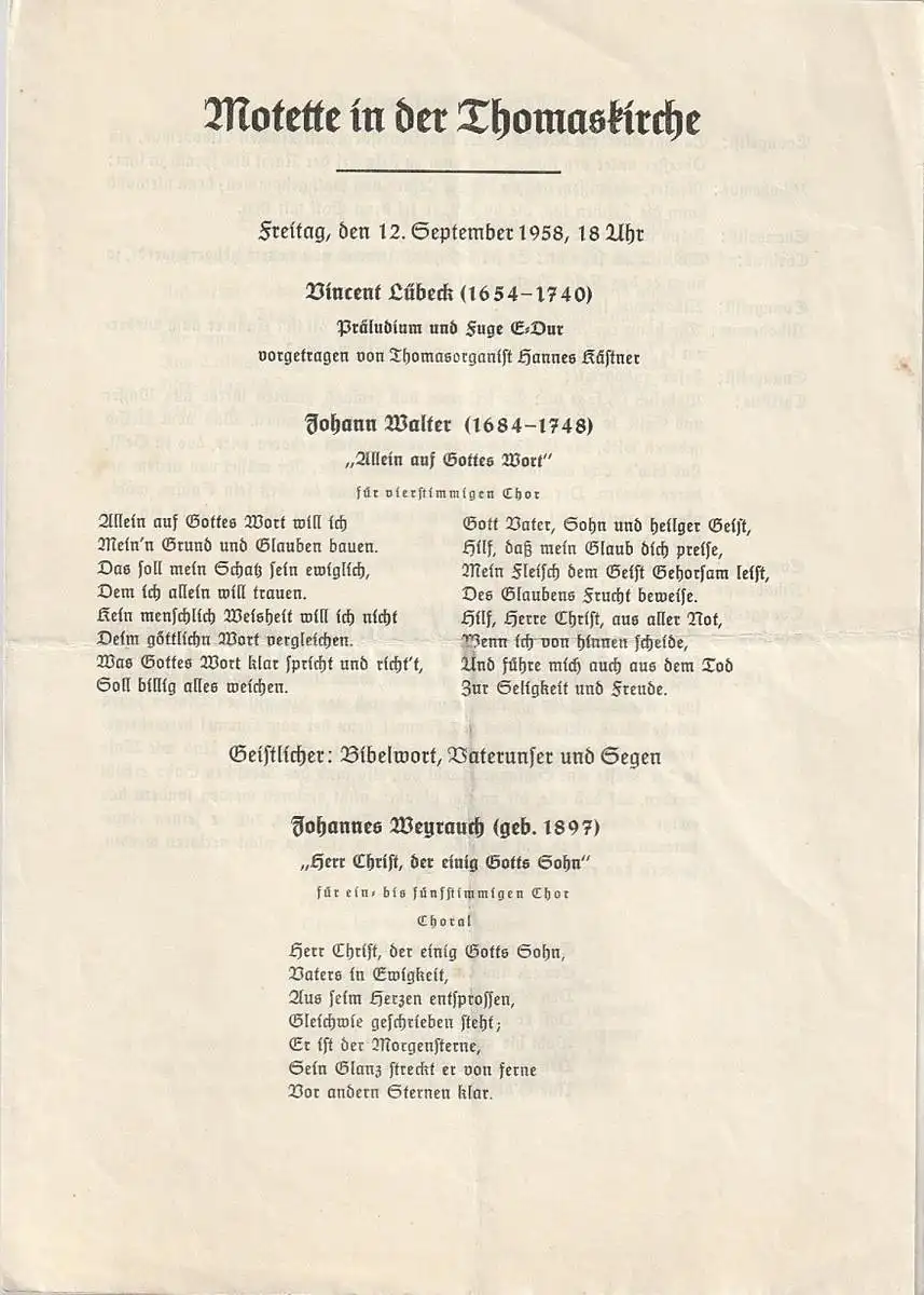 Mitwirkende: Thomanerchor, Gewandhausorchester, Roswitha Trezler, Alt / Hans-Joachim Rotzsch, Tenor- Leitung: Thomaskantor Kurt Thomas. Programm: VINCENT LÜBECK: Präludium und Fuge C-Dur, vorgetragen von Hannes Kastner. JOHANN WALTER: Allein auf Gottes Wort, für vierstimmigen Chor. JOHANNES WEYRAUCH: Herr Christ,der einig Gottes Sohn, für ein - bis fünfstimmigen Chor. Präludium a-Moll. JOHANN SEBASTIAN BACH: Kantate Nr. 99, Was Gott tut das ist wohlgetan - Theaterprogramm, Opernprogramm, Ballettprogramm, Musicalprogramm, Konzertprogramm, Theatermemorabilia, Programmhefte Sammlung, deutsche Theatergeschichte.