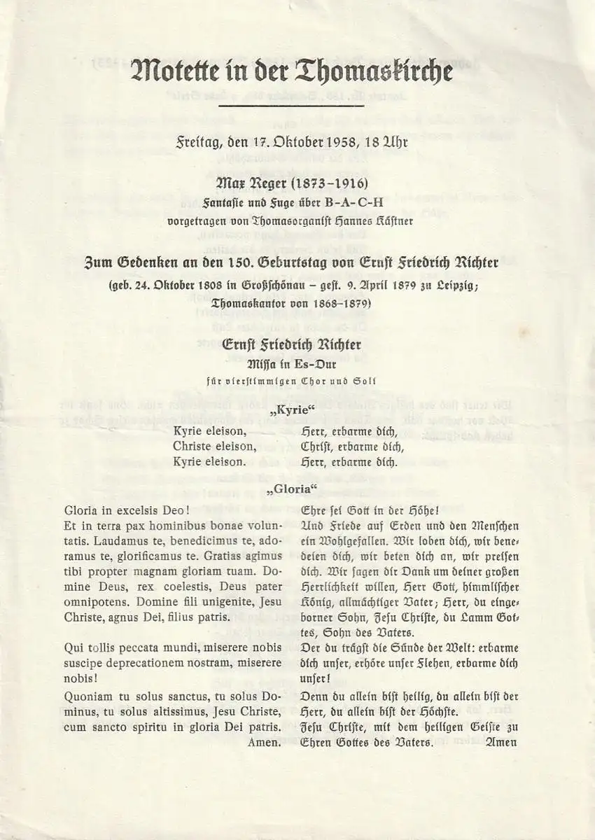 Titel: Programmheft MOTETTE IN DER THOMASKIRCHE 17. Oktober 1958 Zum Gedenken an den 150. Geburtstag von Ernst Friedrich Richter