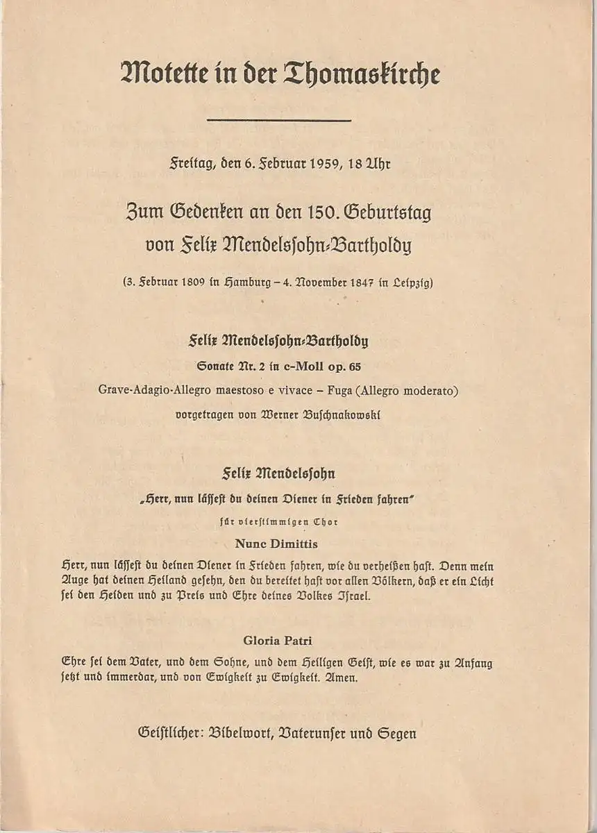 Thomaskirche Leipzig: Programmheft MOTETTE IN DER THOMASKIRCHE 6. Februar 1959 Zum Gedenken an den 150. Geburstag von Felix-Mendelssohn-Bartholdy.