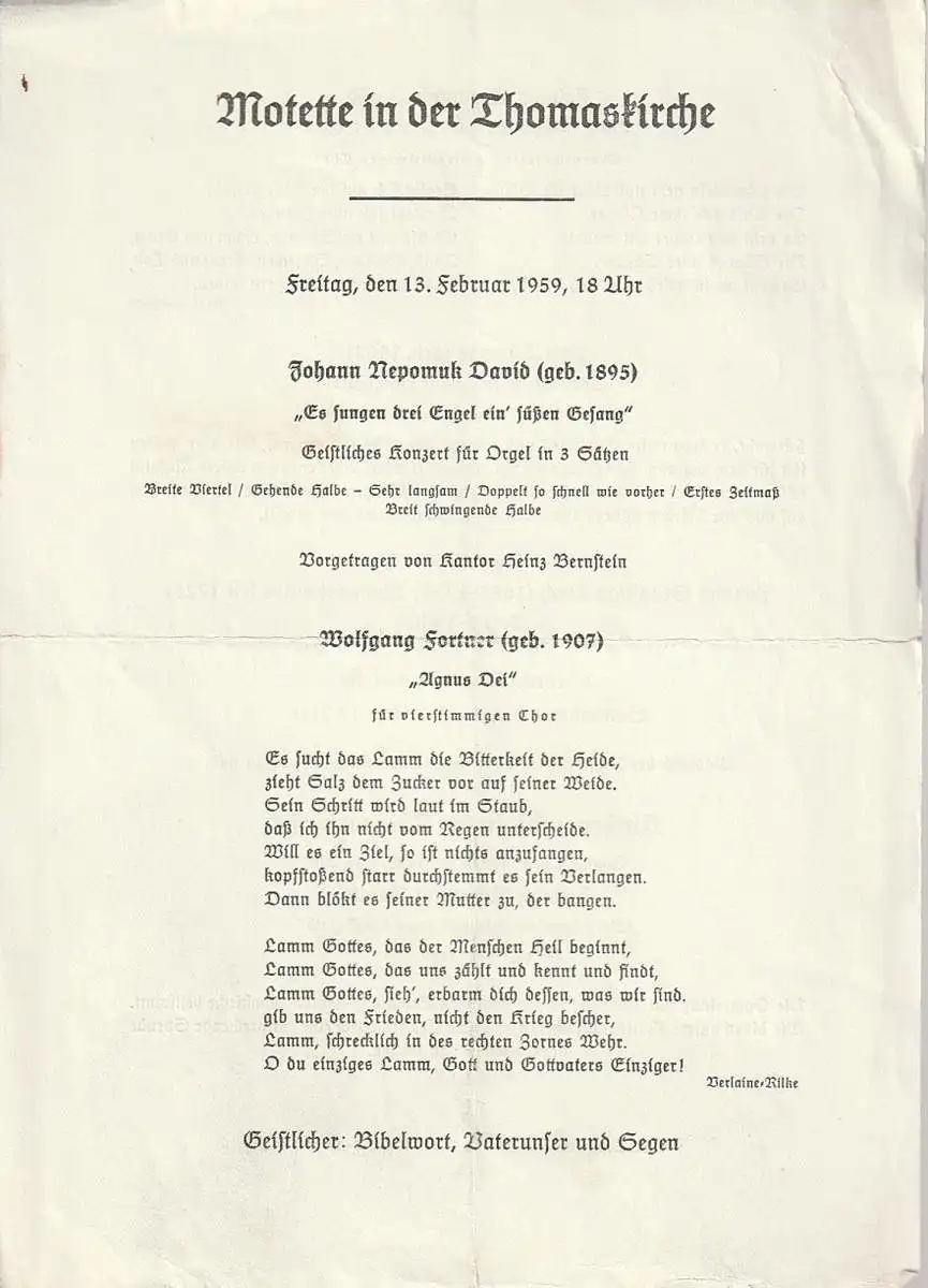 Thomaskirche Leipzig: Theaterzettel MOTETTE IN DER THOMASKIRCHE 13. Februar 1959.