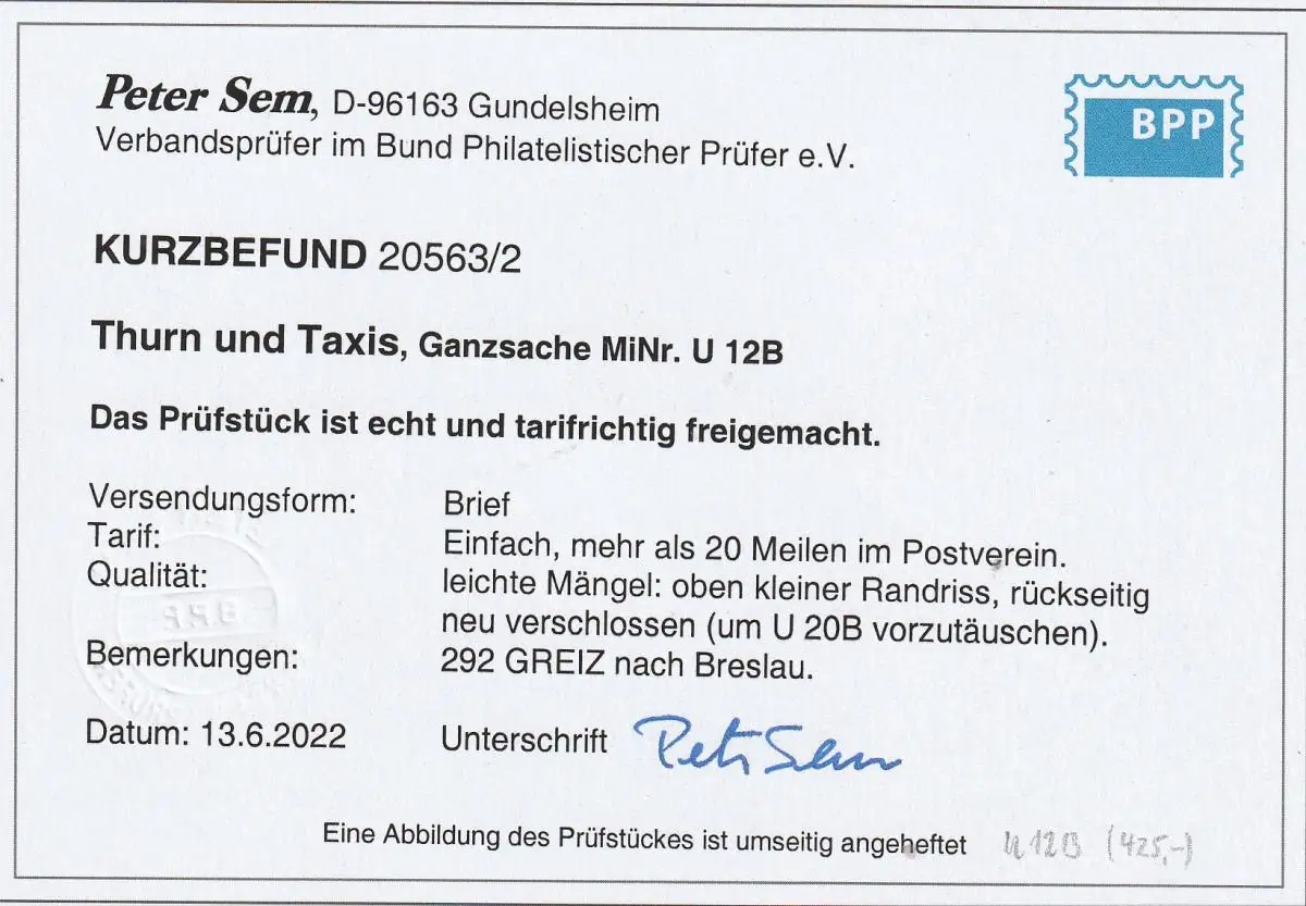 Thurn&T.: Seltener Ganzsachenumschlag U 12B, Befund Sem BPP