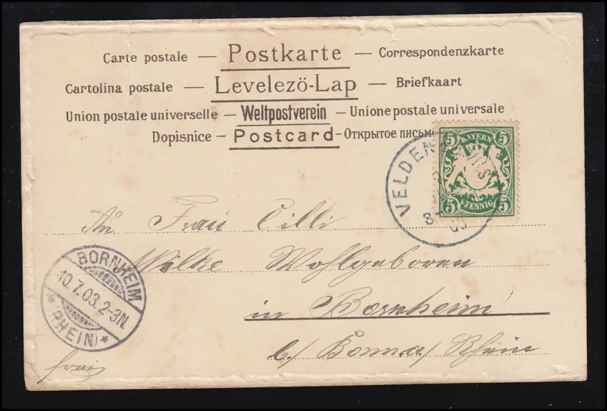 Ankunftsstempel BORNHEIM (RHEIN) 10.7.03, Kartenknick laut Abbildung