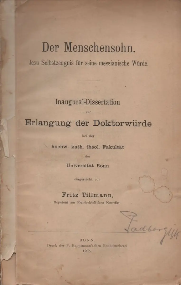 Tillmann, Fritz: Der Menschensohn. Jesu Selbstzeugnis für seine messianische Würde. (Dissertation).