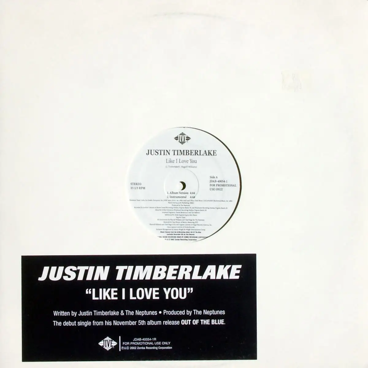12" Maxi Justin Timberlake - Like I Love You, Promo, neutrales Cover mit Info-Aufkleber; The Neptunes, Zustand Platte VG Hülle VG; Made in United States 2002 Jive JDAB-40054-1R, Tracks Album Vers. 4:44, Instr. 4:44, Ext. Club Mix I 5:37, Ext. Club Mix II 7:08
