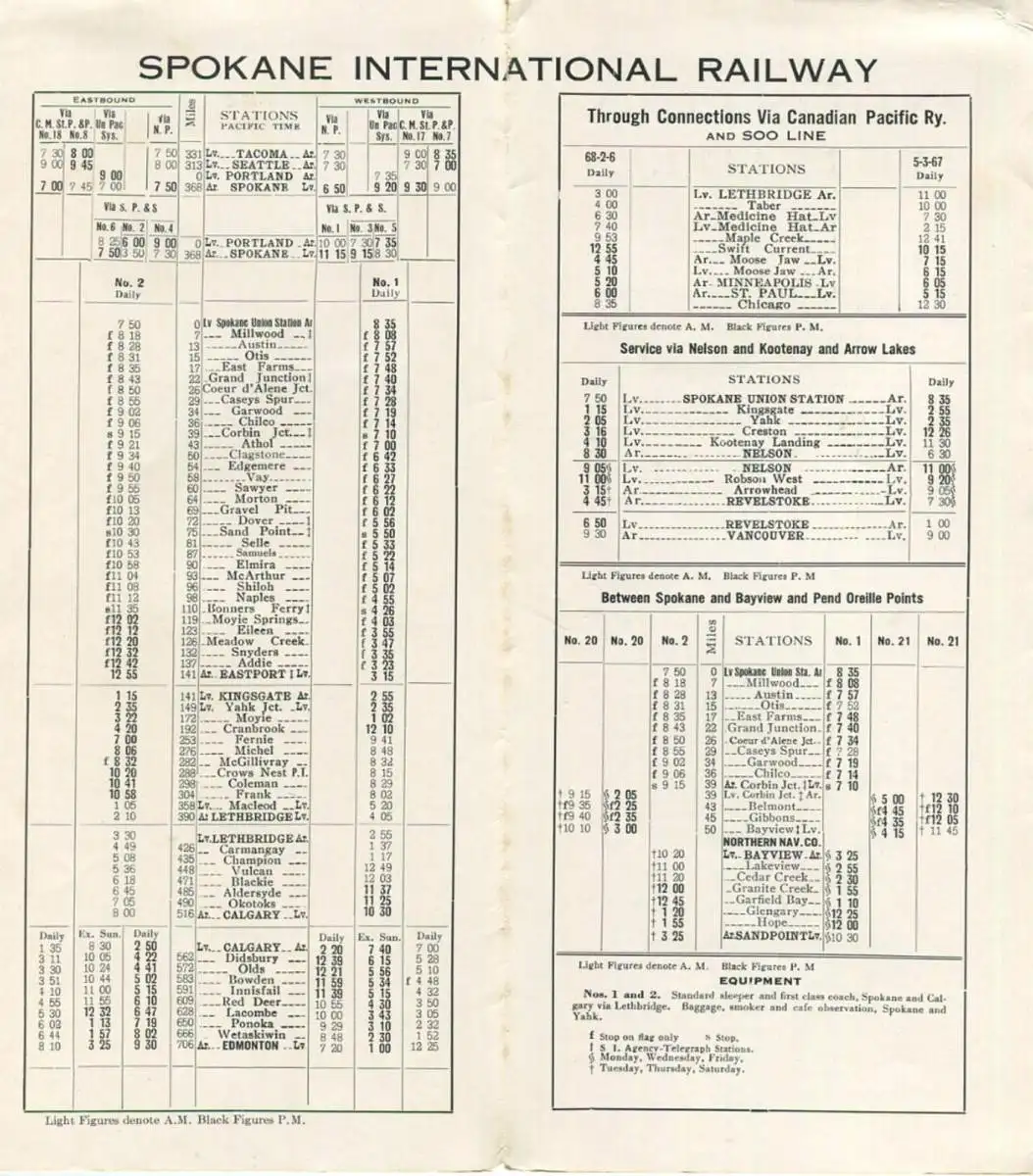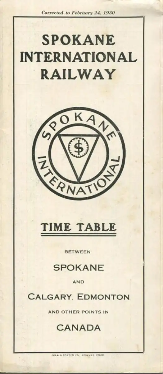 Time Table 1930 - Spokane International Railway - Fahrplan between Spokane and Calgary Edmonton and other points in Cana