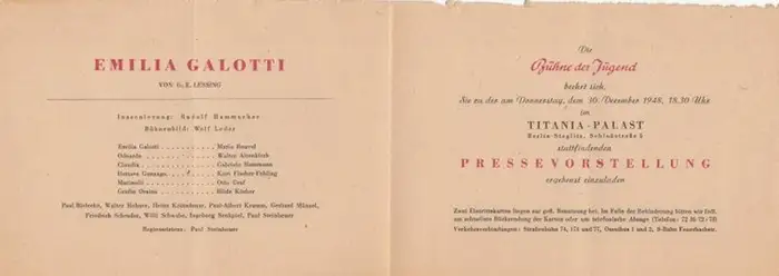 Titel: Emilia Galotti. Programmzettel des Titania-Palastes Berlin. Bühne der Jugend. Insz.: Rudolf Hammacher, mit u.a.: Maria Rouvel, Walter Altenkirch, Kurt Fischer-Fehling, Hilde Körber, Gabriele Hessmann, Otto Graf, Willi Schwabe